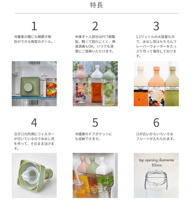 1,200mlの大容量なので、水出し茶はもちろんフレーバーウォーターをたっぷり作って保存して置けます。