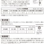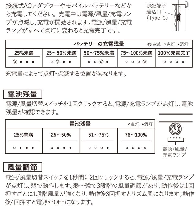 | 仕様 | 重量 135g 電源 DC5V 0.9A 消費電力 4.5W 充電電池 リチウムイオンポリマー電池3.7V 3000mAh 充電時間(約) 5時間 満充電時の合計使用可能時間(約) 4.5時間(強)~13時間(弱) 風量調節 3段階(弱/中/強) リズムモード 有 電源コード(約) USBコード:950mm(Type-C) 羽根径(約) 60mm 羽根枚数 7枚 |
