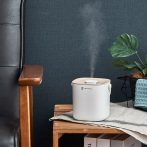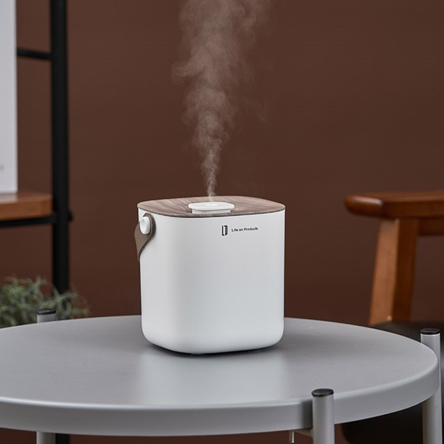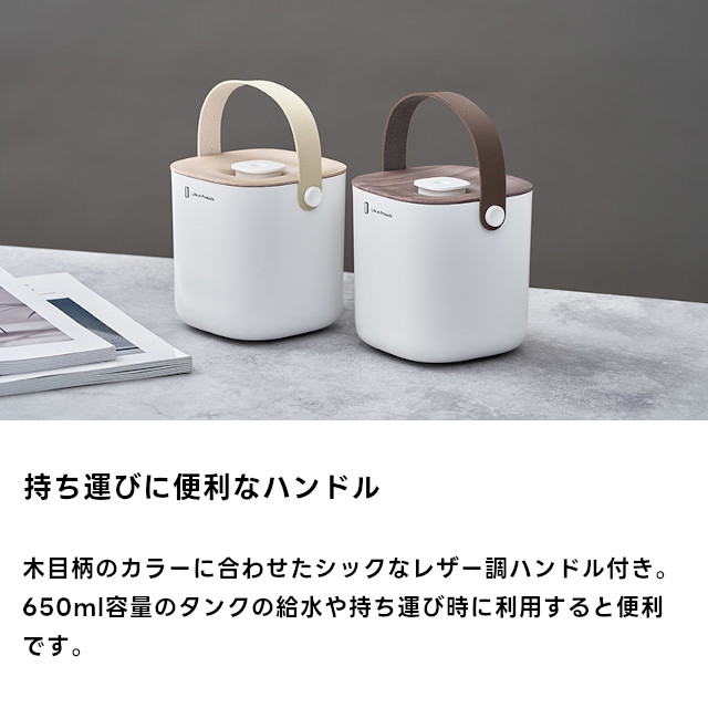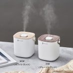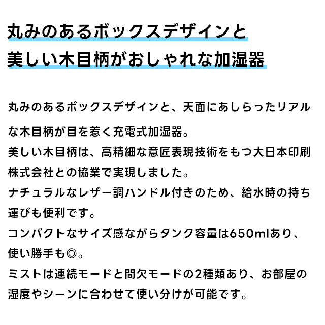 丸みのあるボックスデザインと、天面にあしらったリアルな木目柄が目を惹く充電式加湿器。