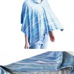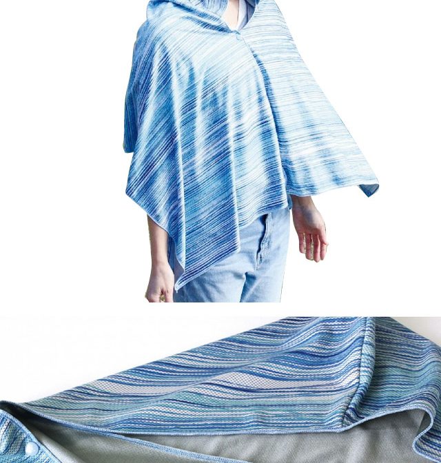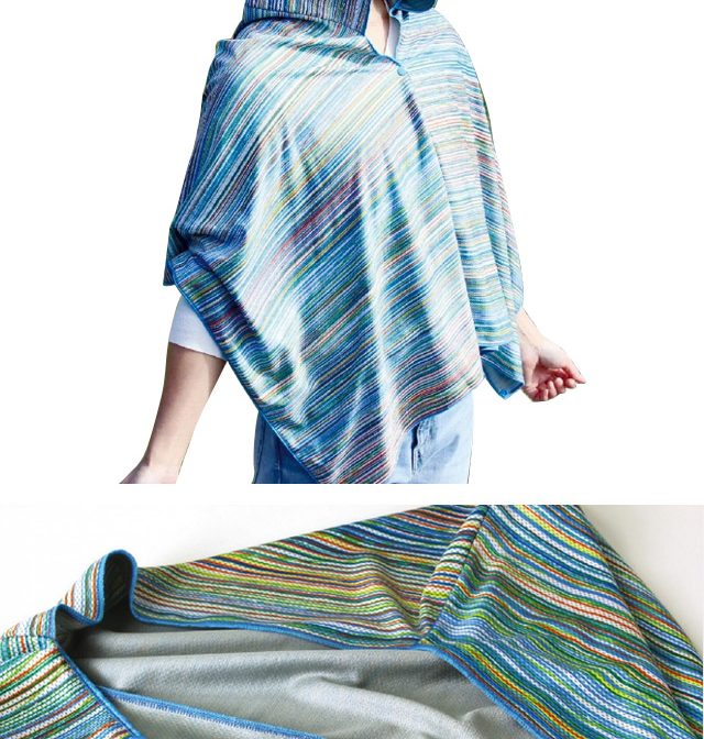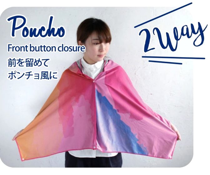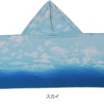 髪の毛や頭、肩全体を紫外線から守るフード付きタオルは、スナップボタンで簡単に着られる点もポイント。