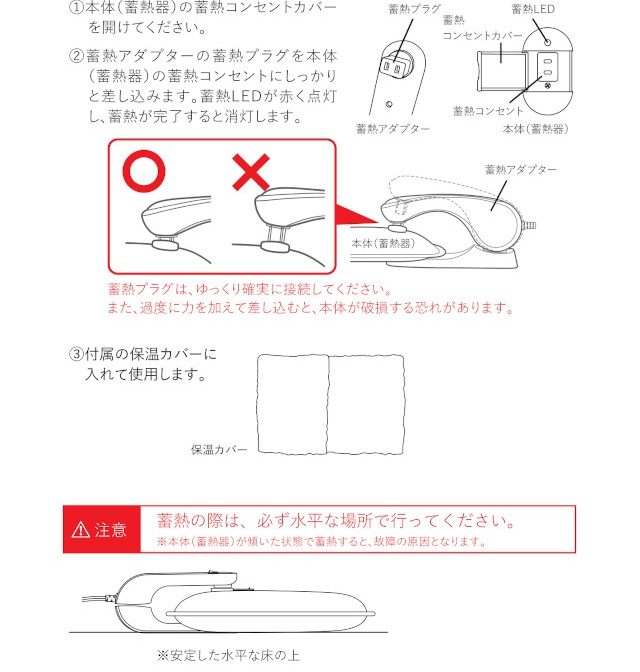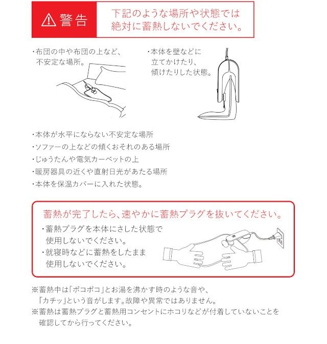 | 仕様 | 重量 1190g 電源 AC100V 50/60Hz 消費電力 270W 電源コード(約) 75cm 蓄熱液 水 蓄熱時間(約) 15分(室温20度の場合) 保温時間(約) あんか目的の場合/7時間(布団内で使用)、カイロ目的の場合/3時間(身体に当てて使用) 蓄熱温度(約) 60度 耐荷重 50kg 保温カバーサイズ 290×210×25mm |