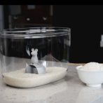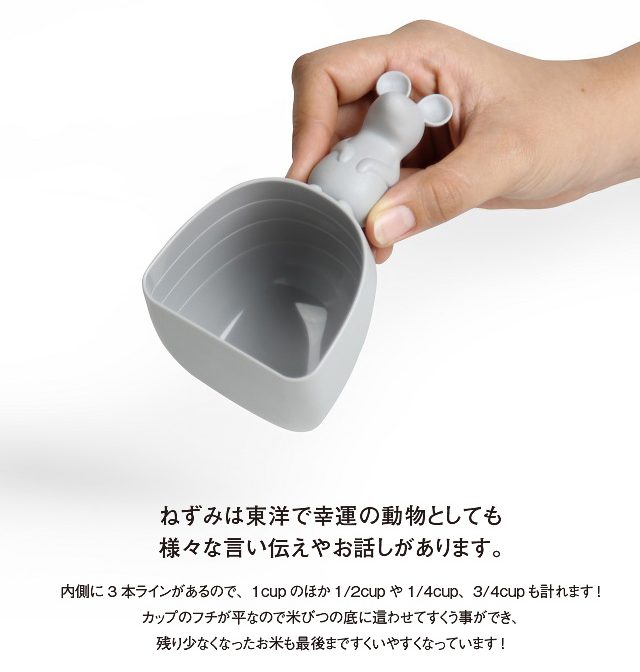 内側に3本ラインがあるので、1cupのほか1/2cupや1/4cup、3/4cupも! ねずみのモチーフが持ち手になるのですくいやすく、米びつのなかで埋もれても見つけやすい。