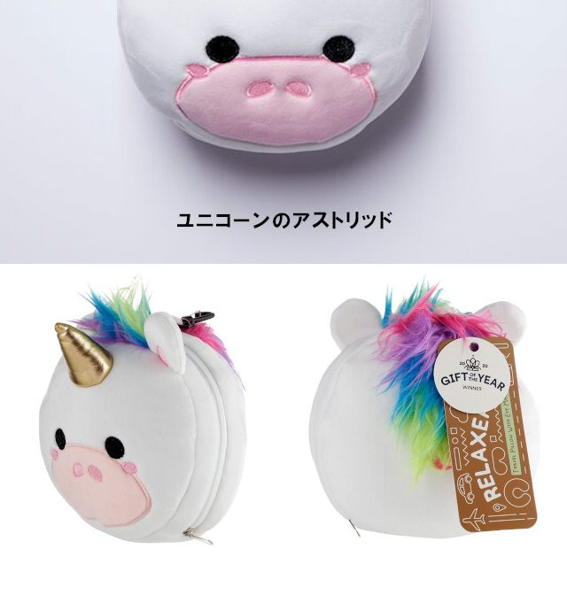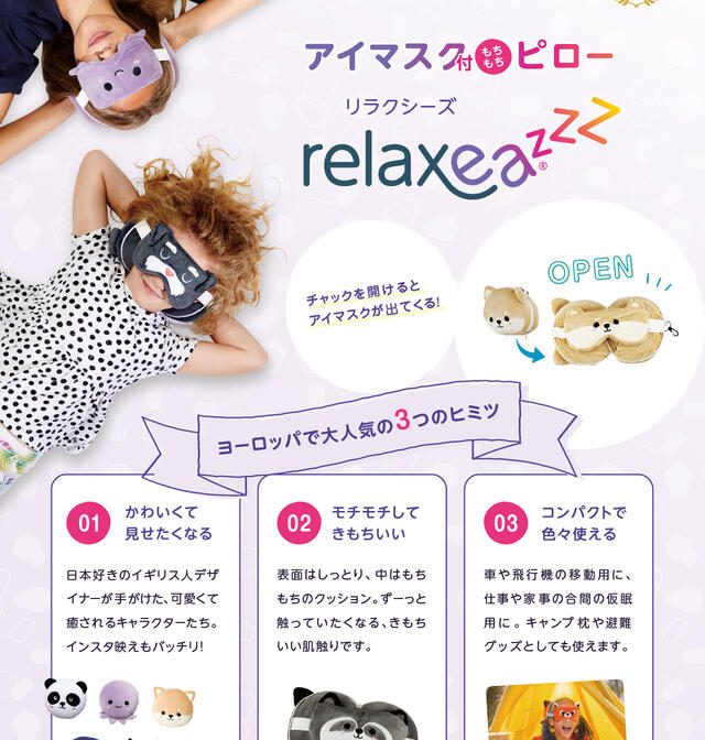 1:アイマスク、2:トラベルピロー(クッション型の携帯枕)、3:ぬいぐるみ の3つが1つになった今までに無い設計で、かわいいデザインはRelaxeazzz®?(リラクシーズ)だけ!
