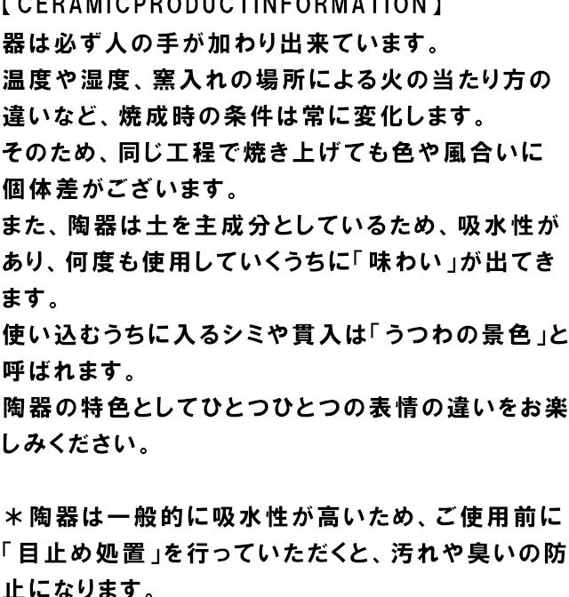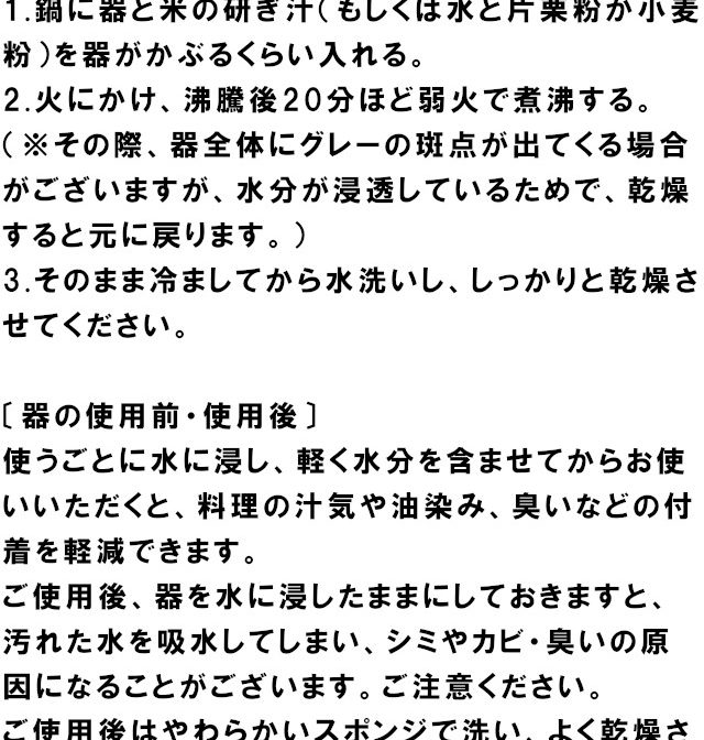 *陶器は一般的に吸水性が高いため、ご使用前に「目止め処置」を行っていただくと、汚れや臭いの防止になります。