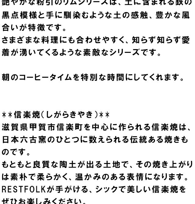 RESTFOLKが手がける、シックで美しい信楽焼をぜひお楽しみください。