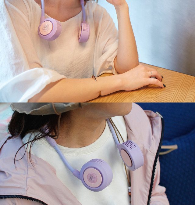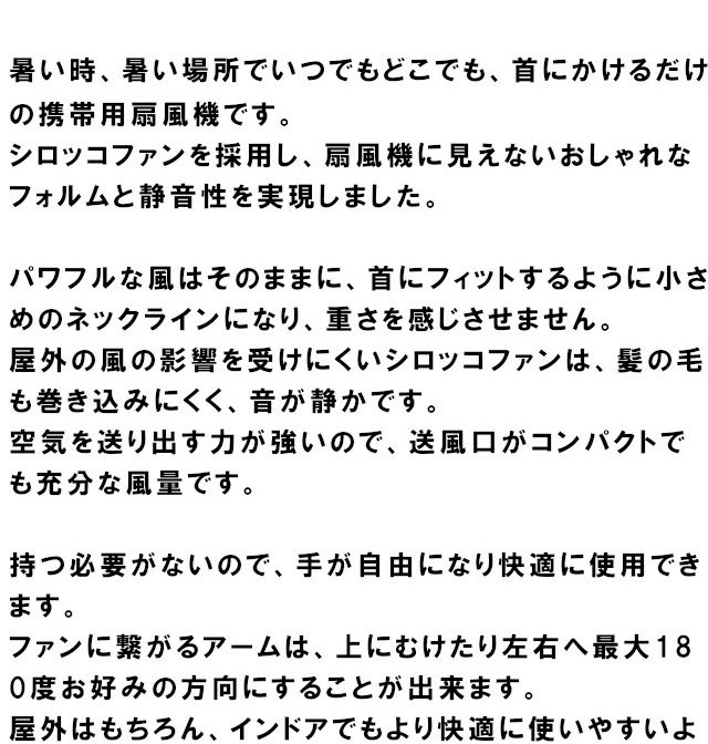 ■暑い時、暑い場所でいつでもどこでも、首にかけるだけの2021年モデル新形状の携帯用扇風機です。