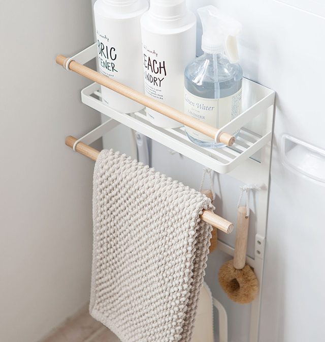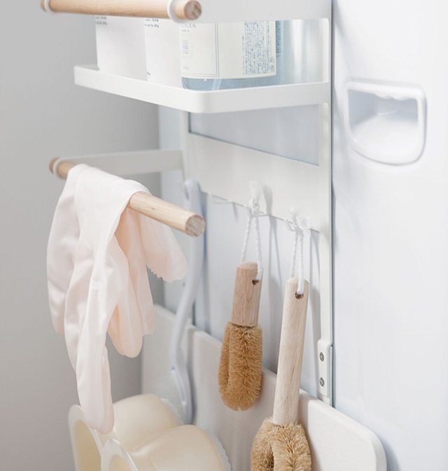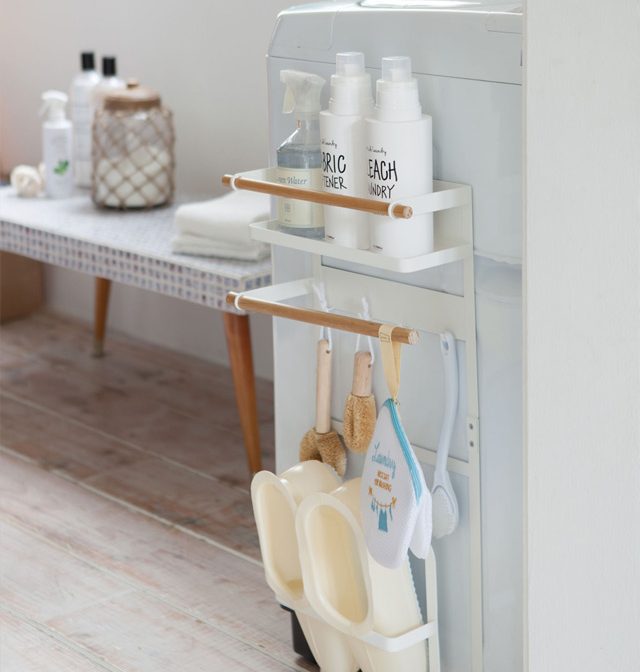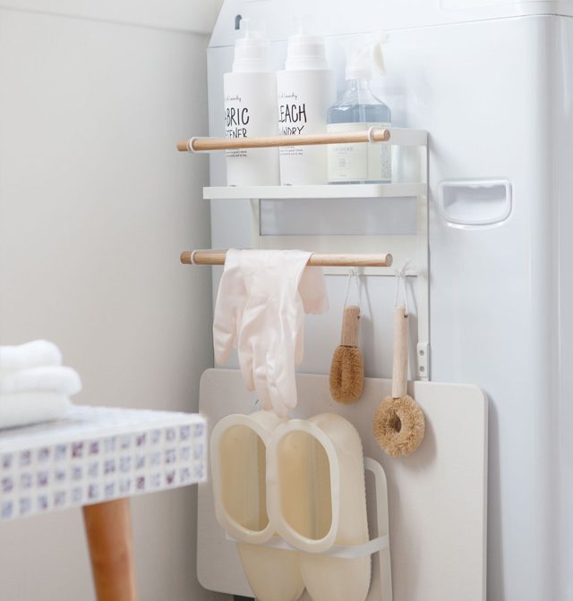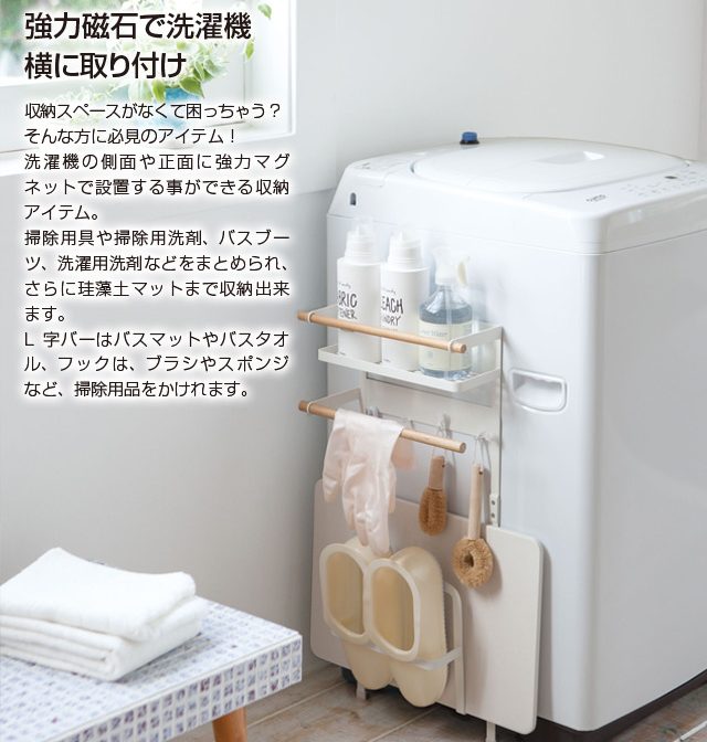 洗濯機の側面や正面に強力マグネットで設置する事ができる収納アイテム。