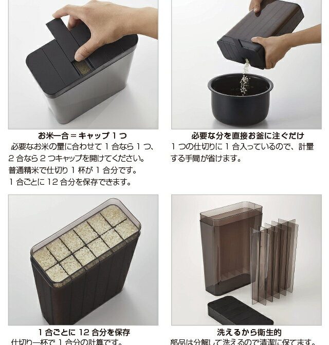 容器は仕切り板で1合(普通米)ずつ仕切られていて、スライド式キャップが1仕切りごとに開くので、使いたい合数分お釜へ注ぐだけ。