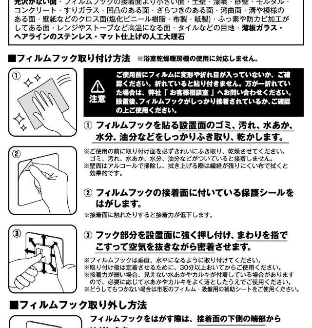 光沢のある平らな油染みしない面 (フィルムフックの接着面よりも大きい面・タイル・プラスチック面・ステンレス・ガラス・金属塗装面)