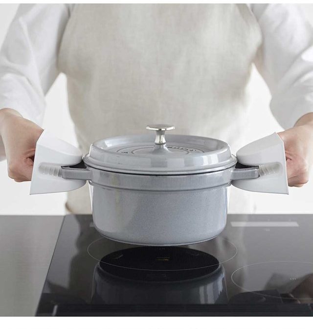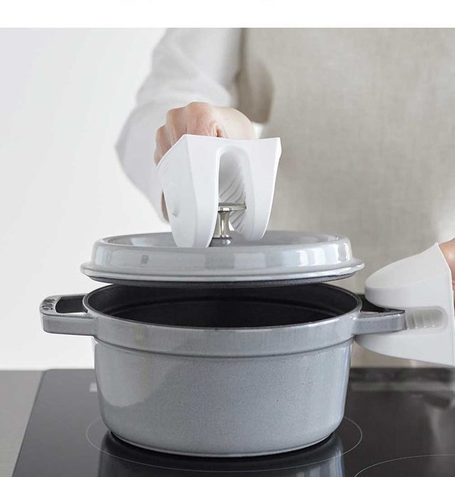 簡単に装着でき、しっかりと掴みやすいシリコーン製の鍋つかみ。