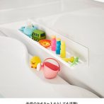 浴槽横のおもちゃやディスプレイ棚として浴槽前の防水テレビ置きとして水はけのよい溝構造。