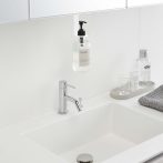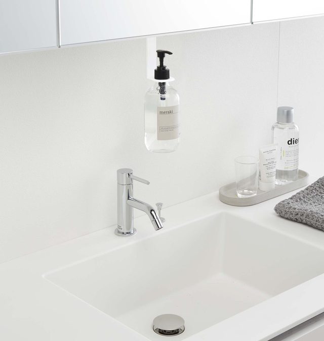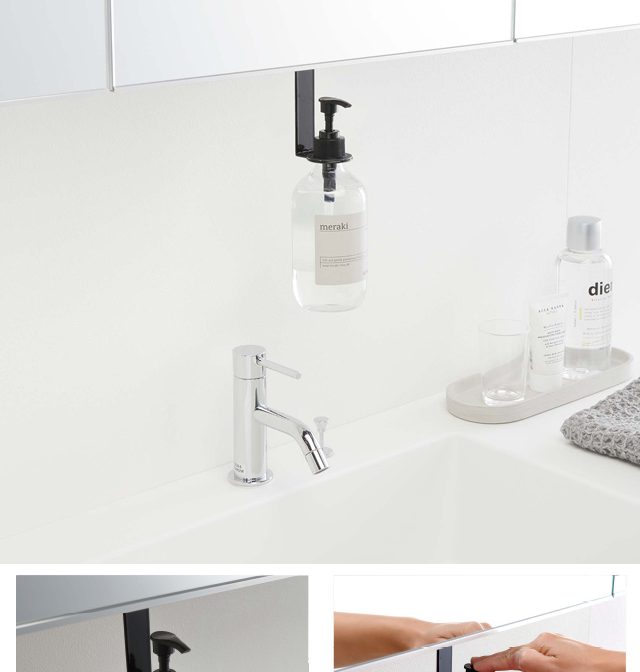 洗面所の吊り戸棚に浮かせて取り付けられるディスペンサーホルダー!