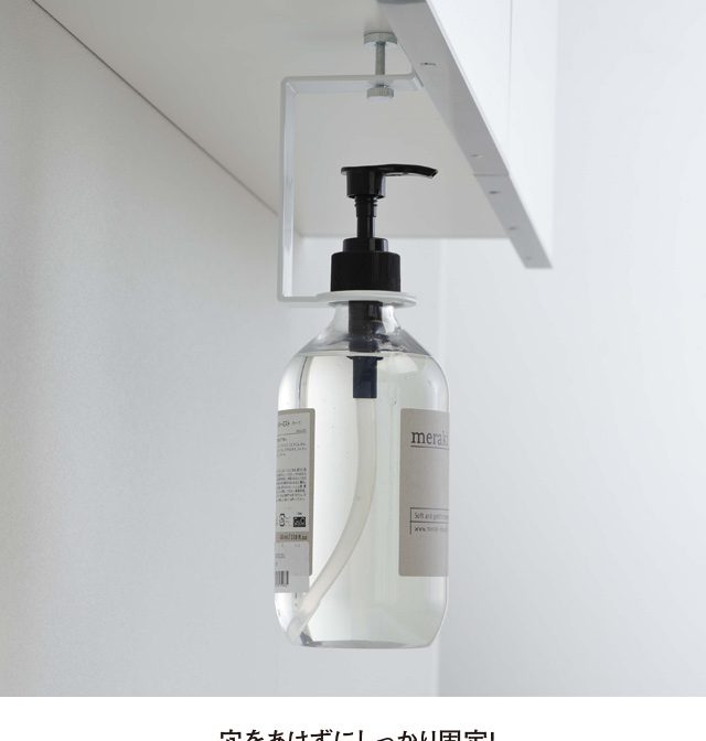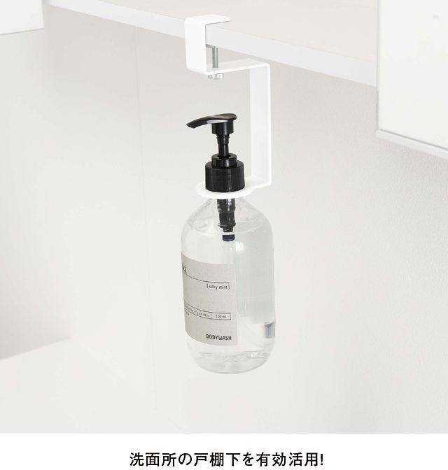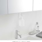 | 対応サイズ・対応箇所 | ディスペンサーのねじ込み部分:約2.4cm~約3.2cm以内 容量約750ml以内を目安にしています。 取り付け可能な洗面所の吊り戸棚 棚板の厚さ約1.3~3cm以内洗面台と吊り戸棚との間に必要な高さ:約15.7cm+収納するもののサイズ以上 付属品:補助リング 穴直径:約2.8cm・補助リング 穴直径:約2.4cm |