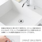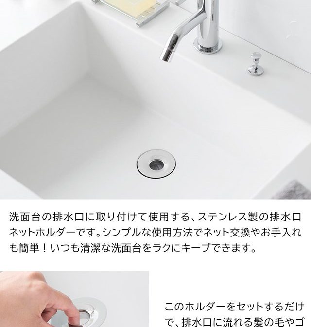 洗面台の排水口に流れる髪の毛やゴミをしっかりとキャッチ!排水口ネットを簡単に脱着できる、ステンレス製の排水口ゴミ受けネットホルダー。シンプルな形状でお手入れも簡単です。