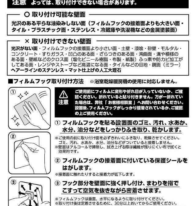 【※注意※】フィルムフックは必ず光沢のある平らな面に貼り付けてください。
