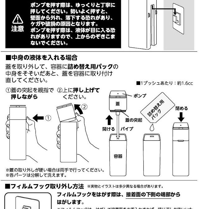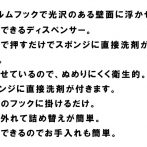 | 素材 | ディスペンサー(容器・蓋:PET-G樹脂 ポンプ:ポリプロピレン パッキン:シリコーン パイプ:ポリエチレン) フィルムフック(フィルム表面・フック部分:ポリカーボネート フィルム中面:PET フィルム接着面:シリコーン) |