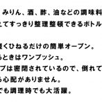 醤油、みりん、酒、酢、油などの調味料を入れ替えてすっきり整理整頓できるボトル。