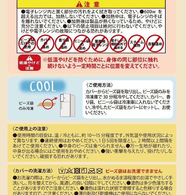 カバー、香り袋、ビニール袋は絶対に電子レンジで加熱しないで下さい。