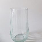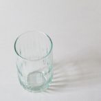 このシリーズは、名前のとおり再生ガラスで作られています。溶かしたガラスを吹き竿ですくい取り、型の中でひとつひとつ息を吹き込んで作る吹きガラス技法で作られます。ひとつひとつ人の手で作っているためガラスの流れや小さな気泡、また口の部分に盛り上がった箇所があったりしますが、これは吹き竿からガラスをカットした後、熱処理した時にガラスが流れて出来るもので、これもまた吹きガラスの特徴です。