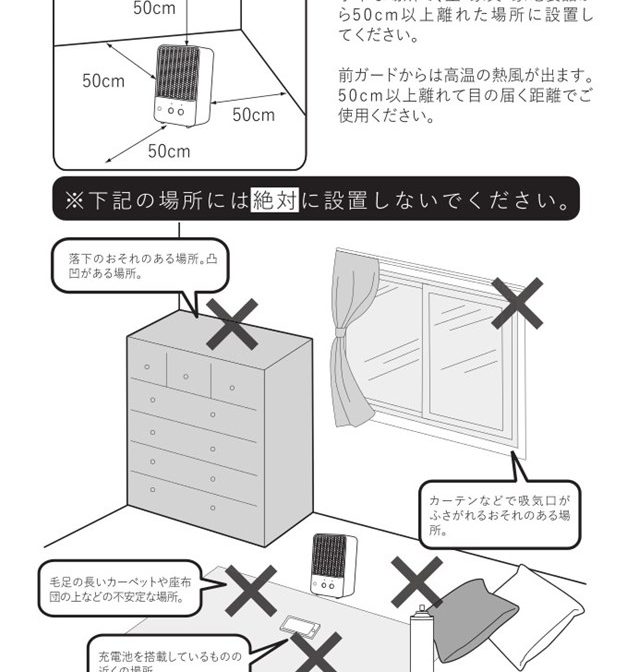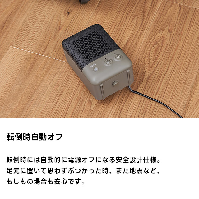 | 仕様 | 消費電力 600W 人感センサー範囲(約) 左右合計60°、上下合計60° 人感センサー距離(約) 1.8m オートオフ(約) 2時間 安全装置 転倒時運転停止用スイッチ、サーモスタット、温度ヒューズ 電源コード(約) 1.5m |