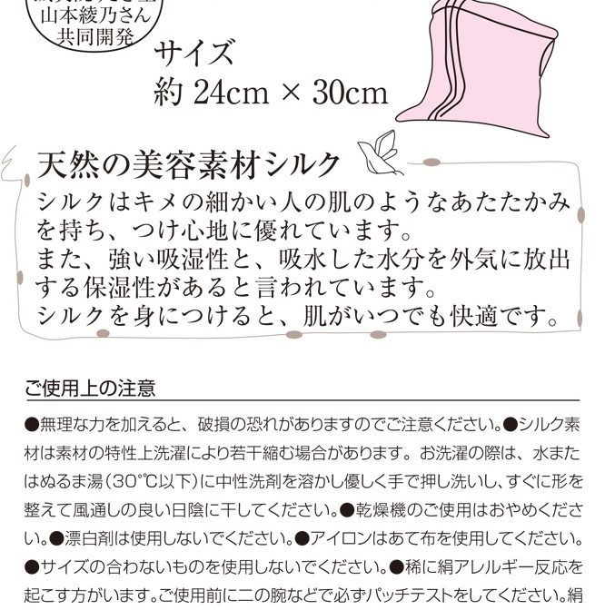 天然の美容素材シルク。シルクはキメの細かい人の肌の様な暖かみを持ち、つけ心地に優れています。また、強い吸湿性と、吸水した水分を外気に放出する保湿性があると言われています。シルクを身につけると、肌がいつでも快適です。