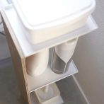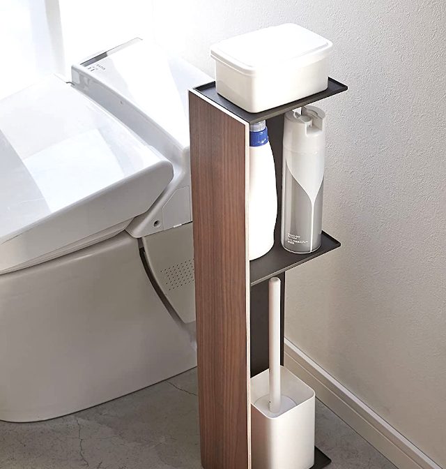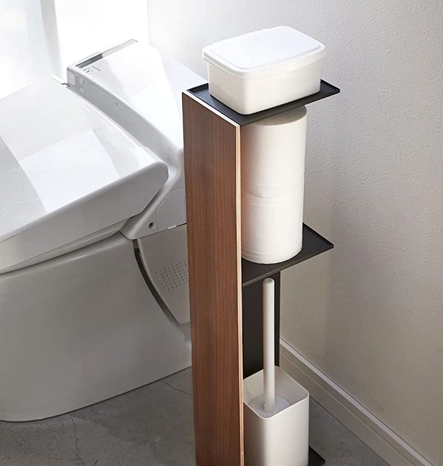 トイレブラシやトイレ用洗剤など掃除用具からトイレットロールペーパーなどを隠して一括収納。