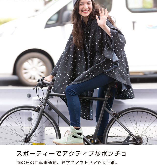 スポーティーでアクティブなポンチョは 雨の日の自転車通勤、通学やアウトドアで大活躍。