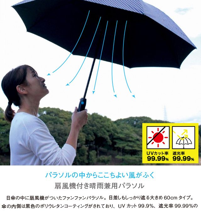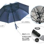 「パラソルの中からここちよい風がふく」扇風機付き晴雨兼用パラソル