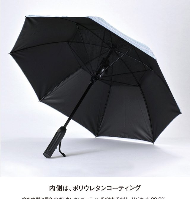 日差しもしっかり遮る大きめ50~60cmタイプ。傘の内側は黒色のポリウレタンコーティングがされており、UVカット99.9%、遮光率99.99%の遮熱加工が施された晴雨兼用傘です。