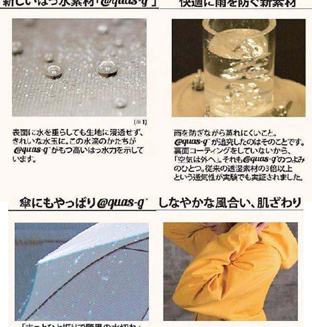 独自開発で実現した、新しいはっ水素材『@quas-g』は、今までになかった水切れの良さ!! 使用後は、パッとはらうだけで、水滴がぽろぽろと簡単に落ちるため、傘を折りたたむ際の不快な手の濡れを軽減してくれます。