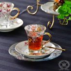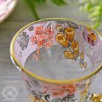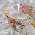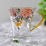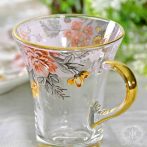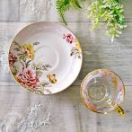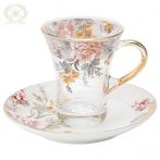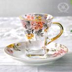 美しいカメリアの花が描かれたお洒落なガラスのティーカップと陶器のソーサーセット。