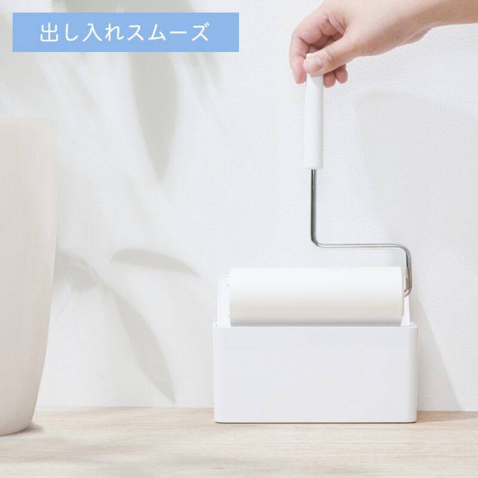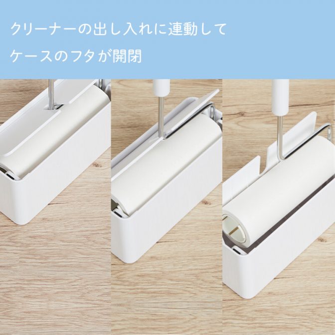 クリーナーの出し入れに連動してケースのフタが開閉するので、出し入れがスムーズなコロコロクリーナーです。インテリアに溶け込むシンプルなデザイン。
