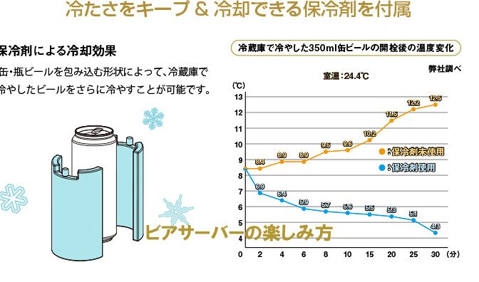 お好みの缶ビールを入れて、超音波できめ細かいクリーミーな泡を作ることができます。全体加圧方式により330ml・350ml・500mlの缶ビールに加え、瓶ビール(小瓶)にも対応し、お店の生ビールサーバーのように、レバーで液体と泡を切り替えられますので、どなたでもお好みのバランスで注ぐことができます。また、ビールを包み込む保冷剤により、冷蔵庫で冷やしたビールをさらに冷やすことが可能です。ガスなどを用意する必要はなく、単3形乾電池2本で動作、グラス・ジョッキを選びませんので、こだわりのグラス・ジョッキで、さらにおいしくビールを楽しめます。