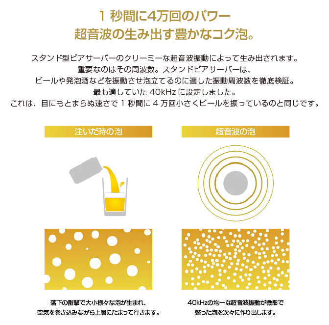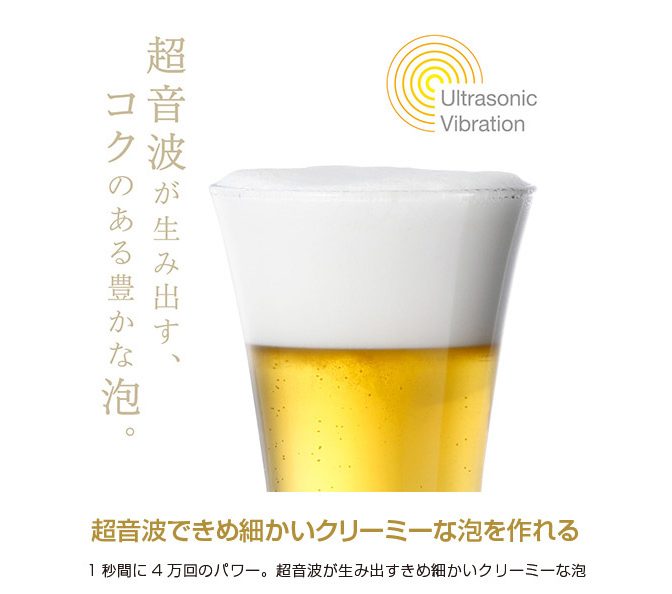 「スタンド型ビアサーバー」は、ご家庭でビアホールのような泡を超音波で簡単に作ることができる家庭用ビアサーバーです。