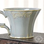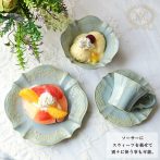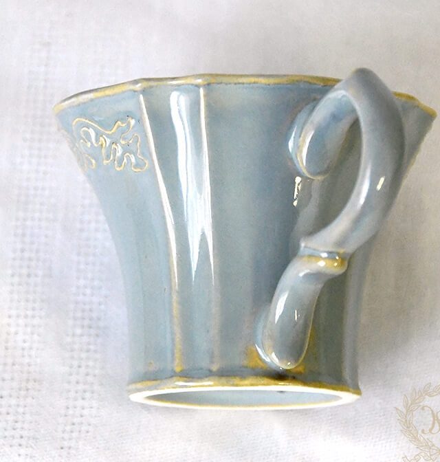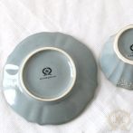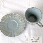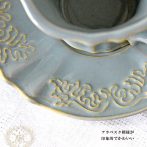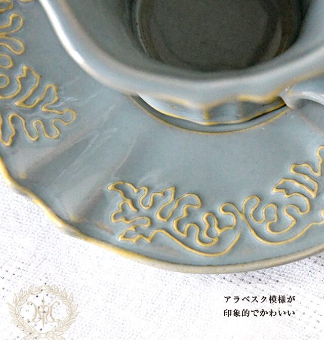 プリーツをきかせたやわらかいシルエットにアラベスク模様が素敵です。 アンティーク調に色むらを付けた淡いブルーがやさしい雰囲気の食器です。 1枚1枚表情の異なるカラーをお楽しみください。