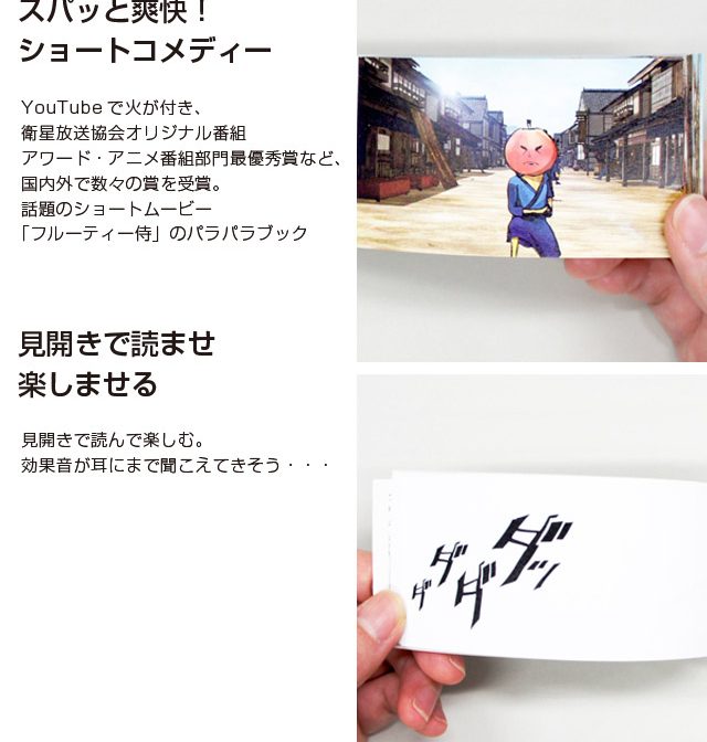 YouTubeで火が付き、衛星放送協会オリジナル番組アワード・アニメ番組部門最優秀賞など、国内外で数々の賞を受賞。話題のショートムービー「フルーティー侍」のパラパラブックが2冊同時に登場。 シュールで爽快な新感覚コメディー。 フルーツ頭の侍たちが、今宵もどこかで火花を散らす!?