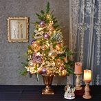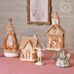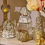 ゴールドのツリーの森に、メタリックカラーの鮮やかなピンクとグリーンの家々が映え、華やかで高級感のあるスノードーム。