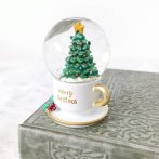 白いティーカップに乗ったかわいいクリスマスモチーフのミニスノードームオブジェ。