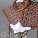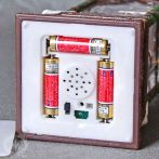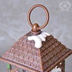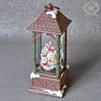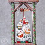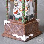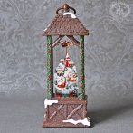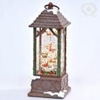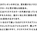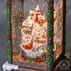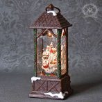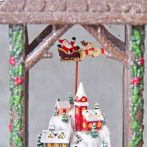 木製風のランタンの中には、空を駆けるソリに乗ったサンタクロースと雪が積もる街並み。