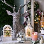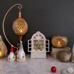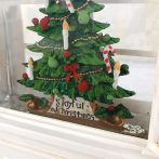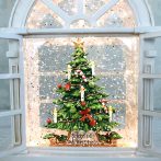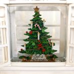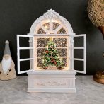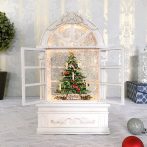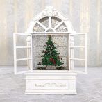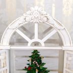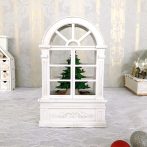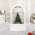 ヨーロッパ調のクラシカルな窓の中に大きなクリスマスツリーが入ったおしゃれなクリスマスオブジェ。