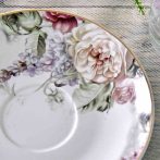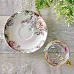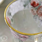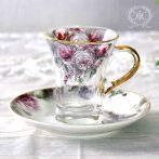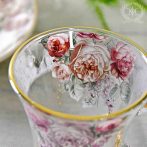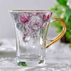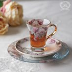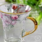 美しい薔薇の花が描かれたお洒落なガラスのティーカップと陶器のソーサーセット。