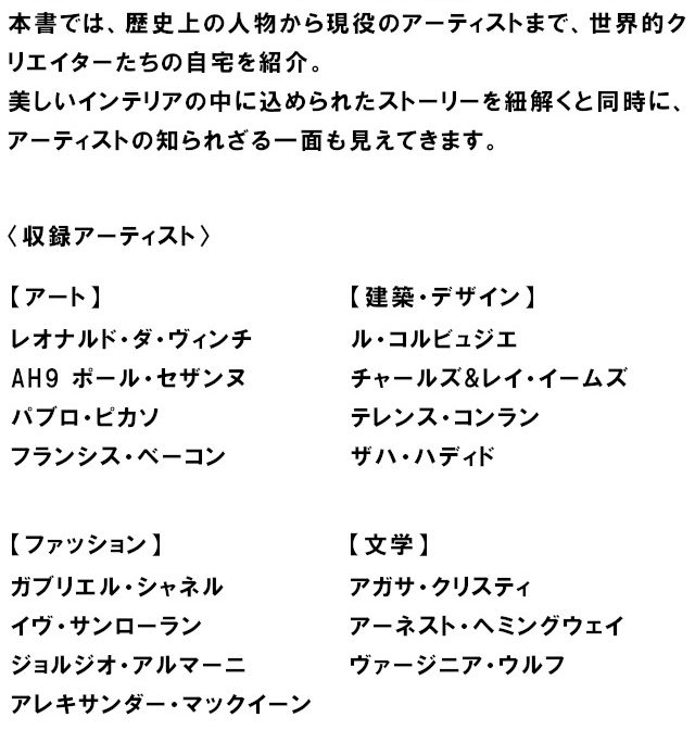 本書では、歴史上の人物から現役のアーティストまで、世界的クリエイターたちの自宅を紹介。