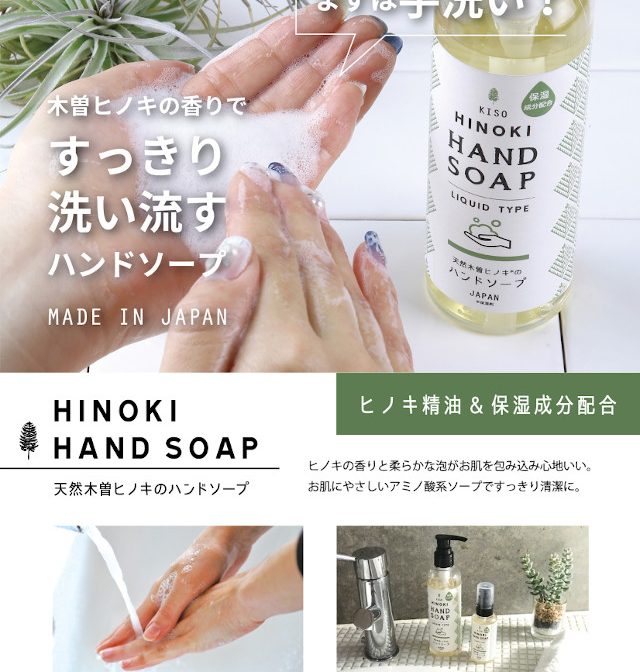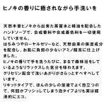 天然木曽ヒノキから出来た蒸留水と精油を配合したハンドソープで、合成香料や合成着色料を一切使用していません。