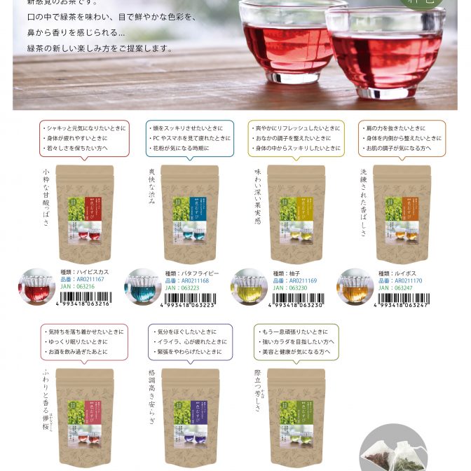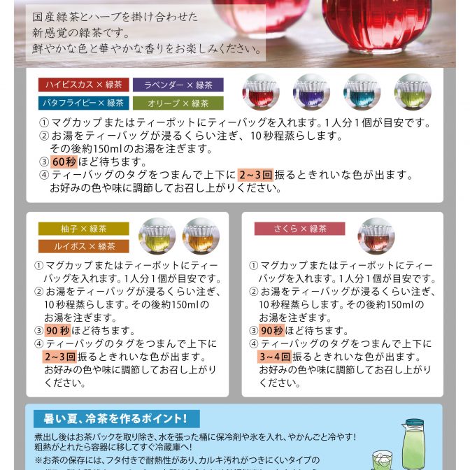 見た目の綺麗さに加えて、それぞれのハーブと緑茶が組み合わさった時に生まれる新しい味わいをお楽しみください。