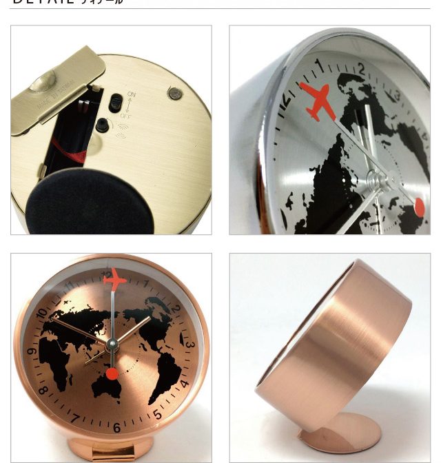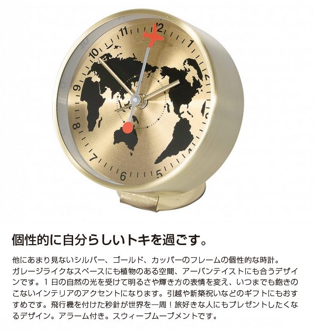 引越や新築祝いなどのギフトにもおすすめです。飛行機を付けた秒針が世界を一周!旅好きな人にもプレゼントしたくなるデザイン。アラーム付き。スウィープムーブメントです。