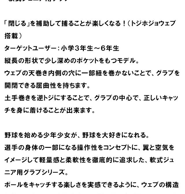 選手の身体の一部になる操作性をコンセプトに、翼と空気をイメージして軽量感と柔軟性を徹底的に追求した、軟式ジュニア用グラブシリーズ。