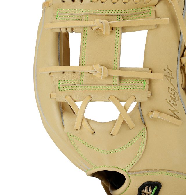 ウェブの天巻き内側の穴に一部紐を巻かないことで、グラブを開閉できる屈曲性を持ちます。