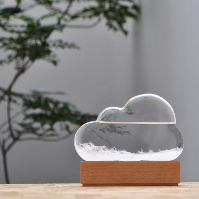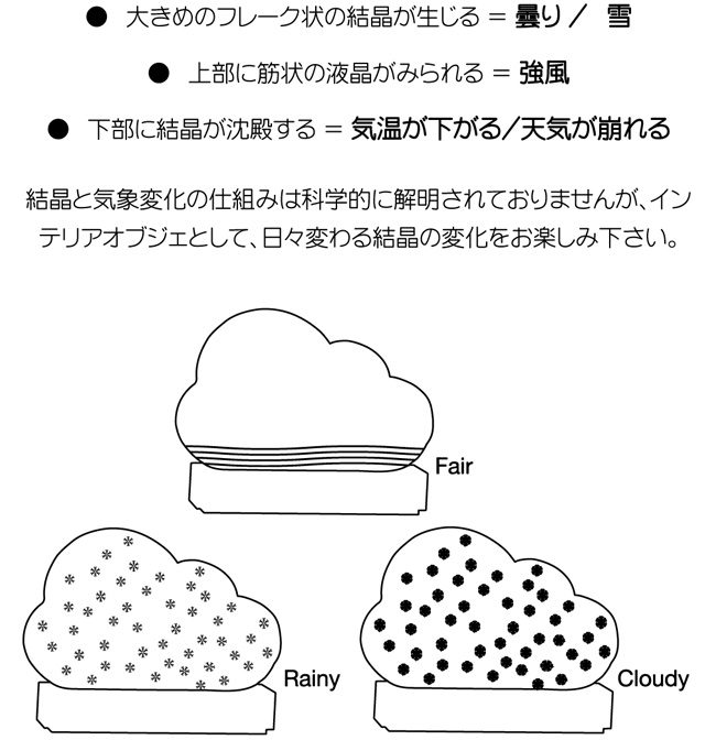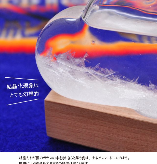 STORM CLOUDは17世紀のヨーロッパで航海士が天気を予測するために使われていた簡易的な気象観測用の機器です。天気管やストームグラスとも呼ばれており、18世紀には気象学の開祖のひとりであるロバート・フィッツロイ(Robert FitzRoy)によって、自身が船長を務めたイギリスの観測船「ビーグル号」の航海で使用され、結晶の現れ方と気象変化のガイドをまとめています。